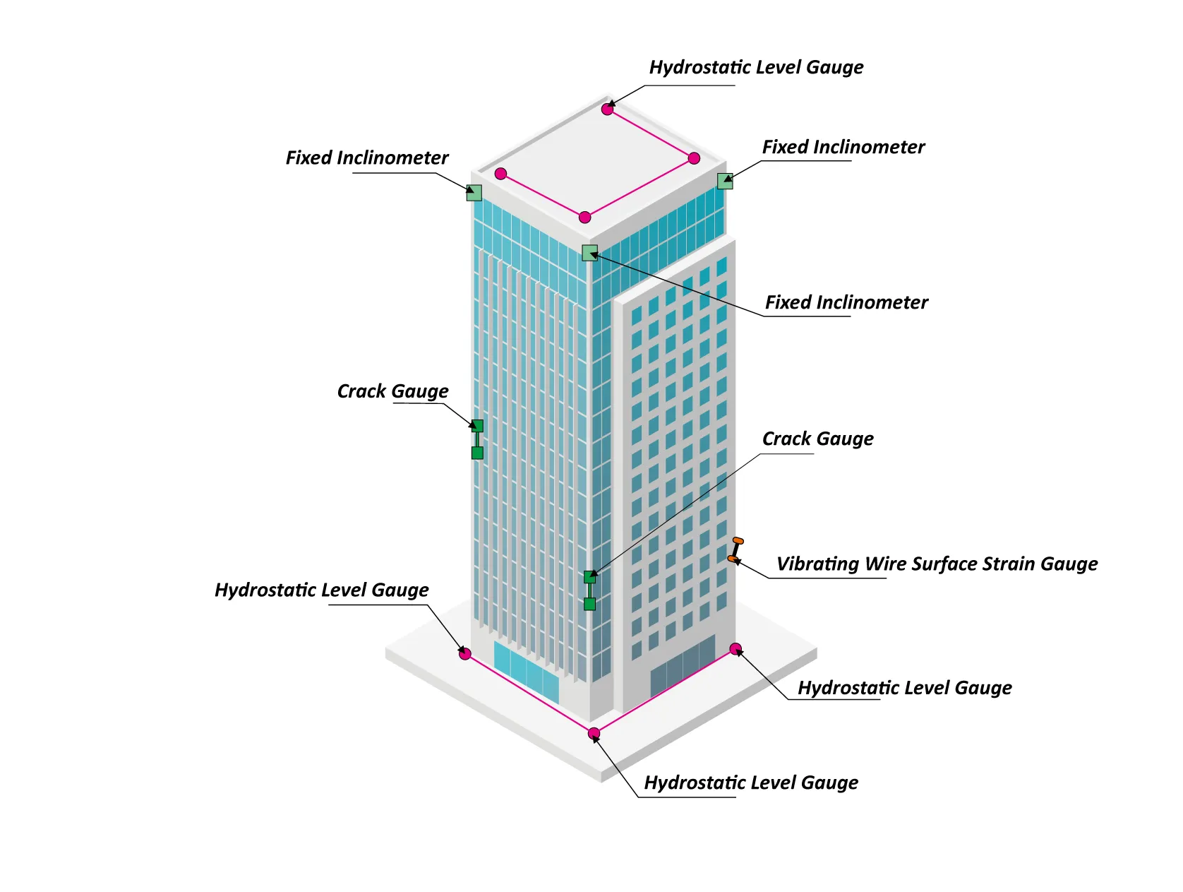 การทรุดตัวของโครงสร้าง รอยแตกร้าวของโครงสร้าง ความตึงของโครงสร้าง การตรวจสอบความเอียงของโครงสร้าง ฯลฯ