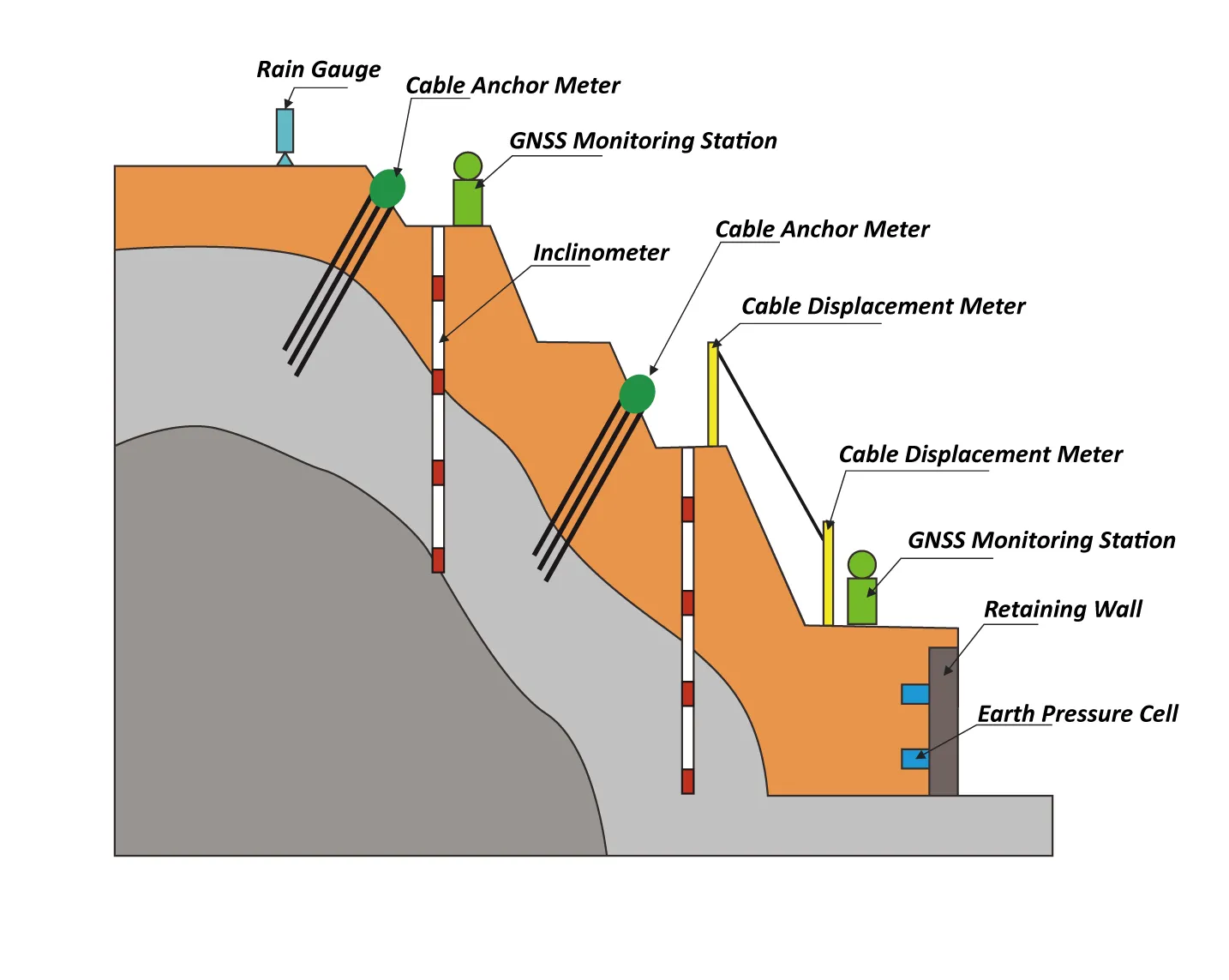 การตรวจสอบการเคลื่อนที่แบบลึก, การเคลื่อนตัวของพื้นผิว, การตรวจสอบสายเคเบิลสมอ, การตรวจสอบปริมาณน้ำฝน, การตรวจสอบระดับน้ำใต้ดิน, สัญญาณเตือนด้วยเสียงและภาพ ฯลฯ